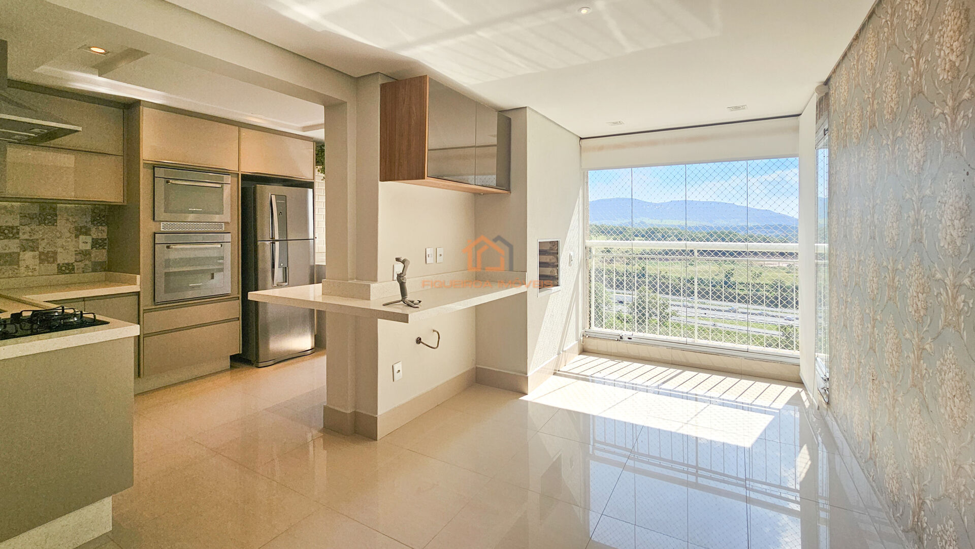 A sala para dois ambientes oferece amplitude e conforto, integrada à varanda com churrasqueira a carvão e uma vista espetacular para a Serra do Japi.