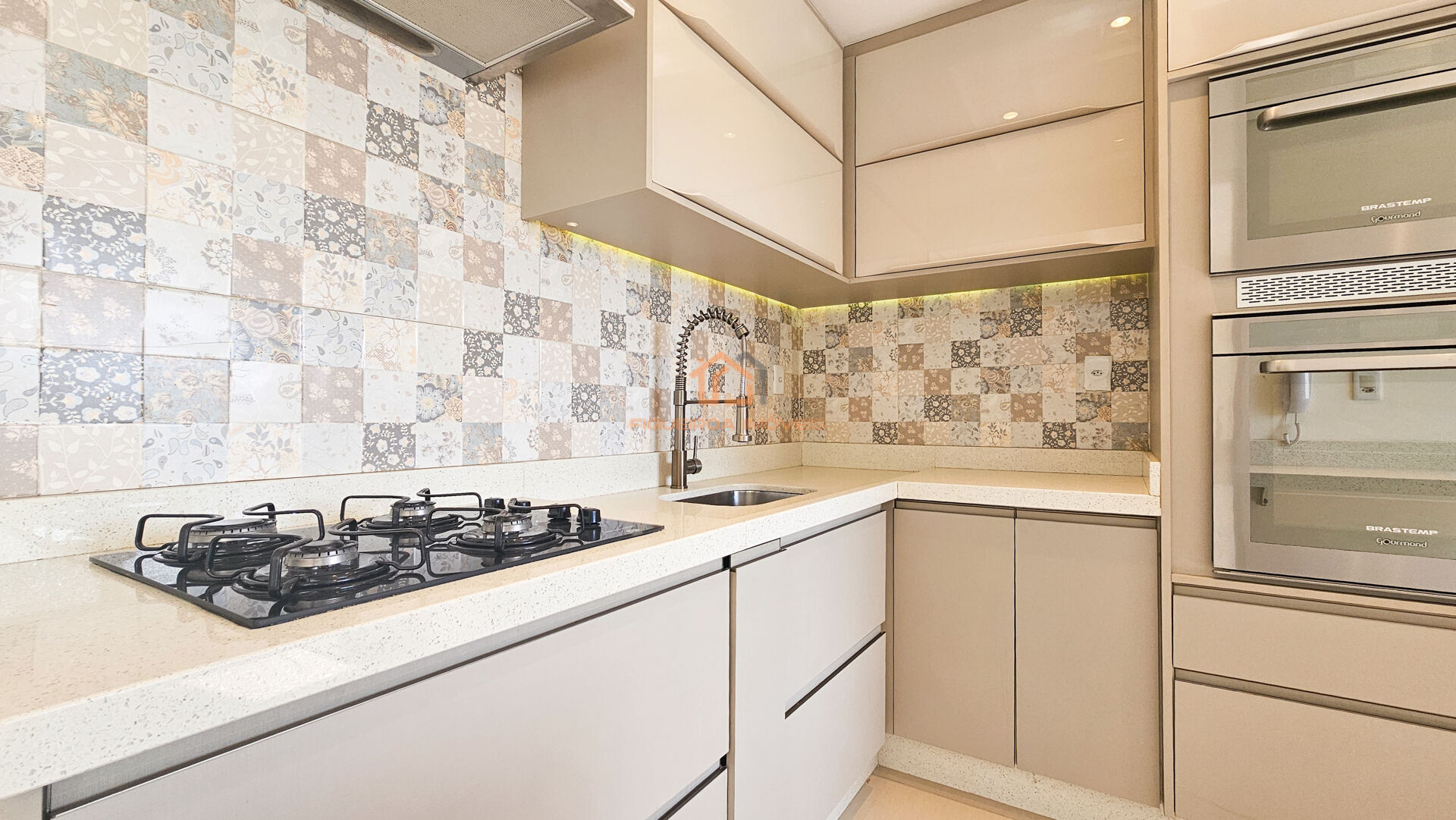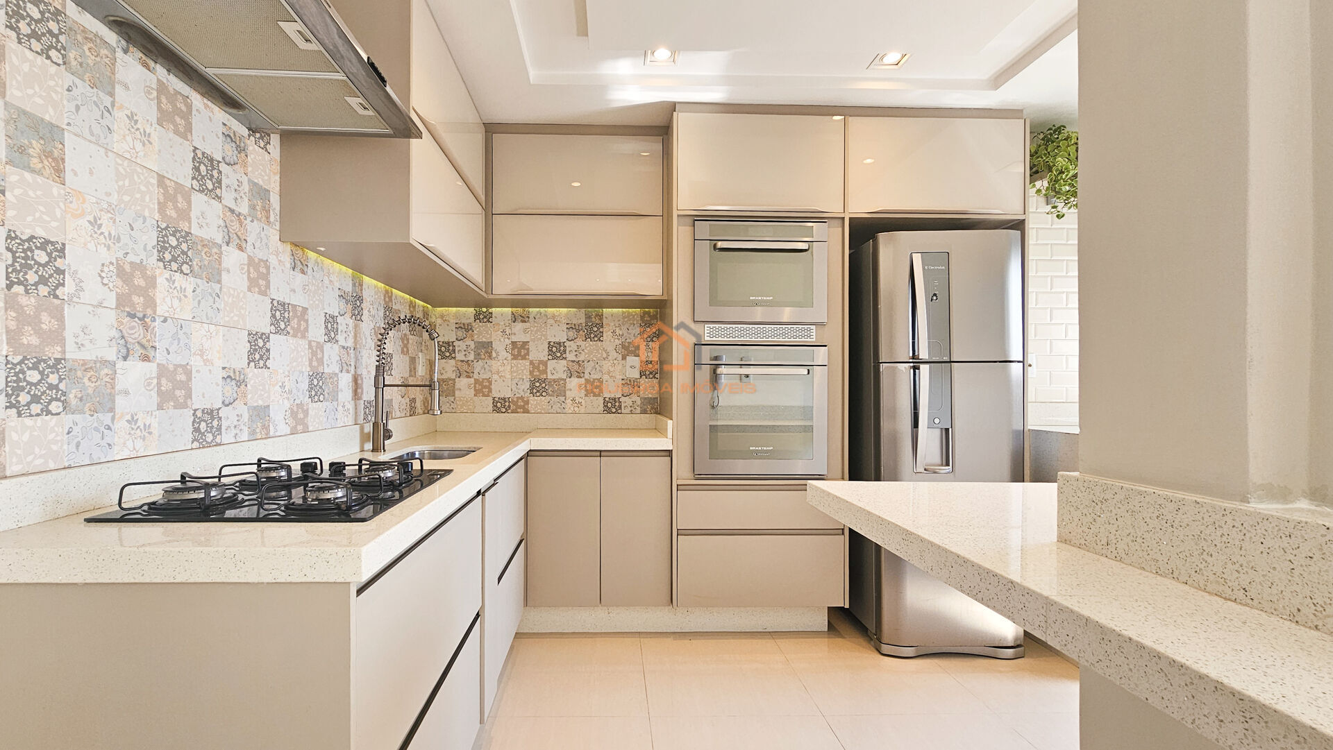 A cozinha planejada e a área de serviço com armários garantem praticidade no dia a dia.